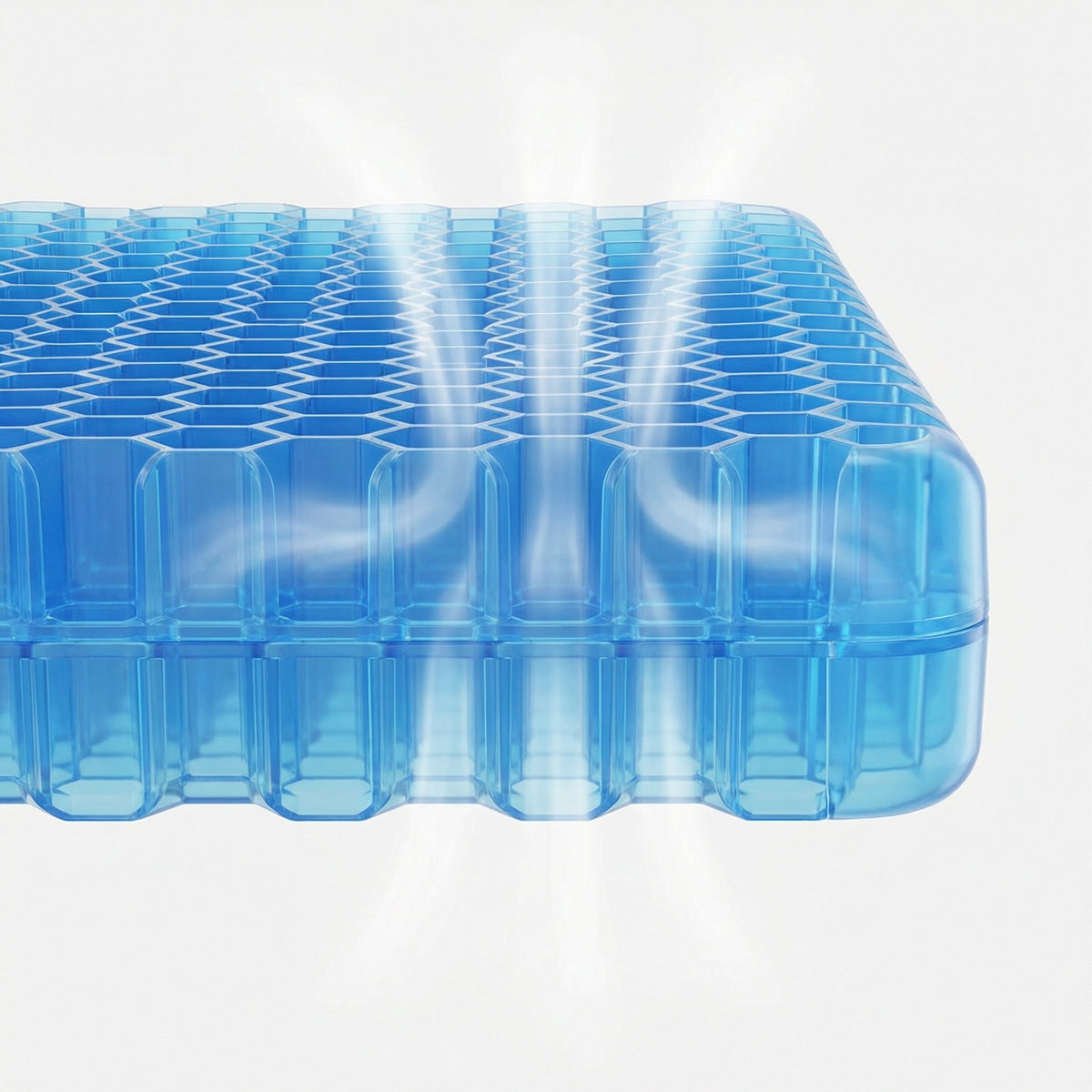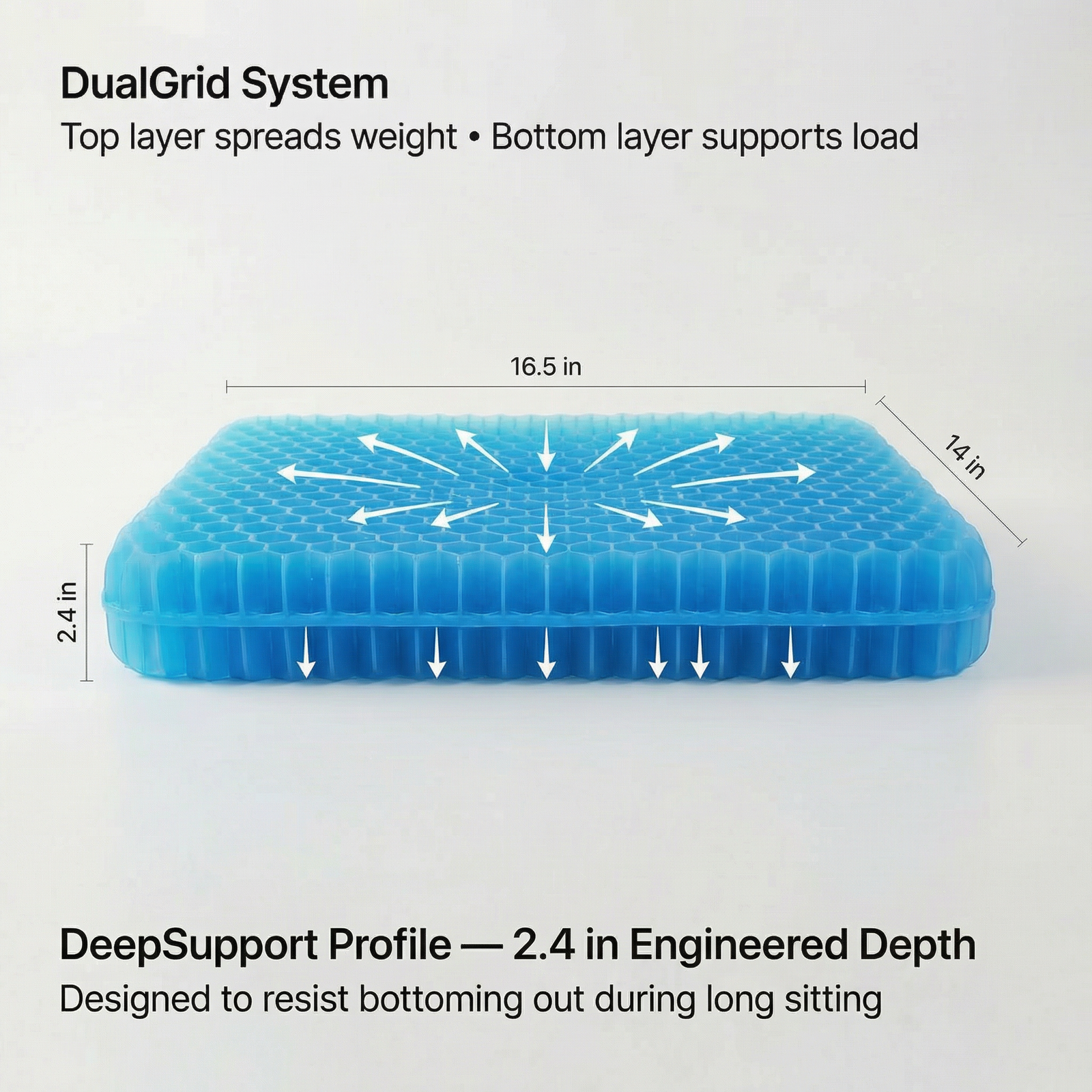 - Construction: Dual-layer gel grid designed for pressure distribution under long sitting.